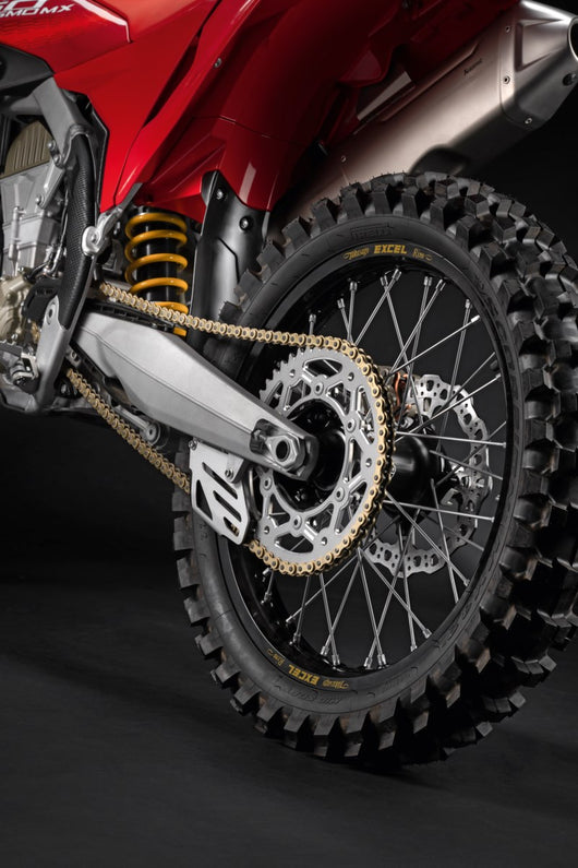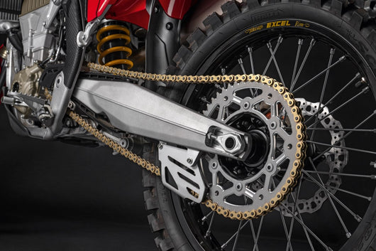 Manufactured from ERGAL 7075T6 aluminum alloy and CNC-machined for optimal lightness with a high finish rating and Z50 teeth. A milled notch is created at the base of each tooth to expel any build-up of dirt or mud, and the surface finish includes hard anodizing to prevent corrosion and extend the life of the component. The high standard of quality includes thorough dimensional and quality controls to ensure maximum durability and precision over time.