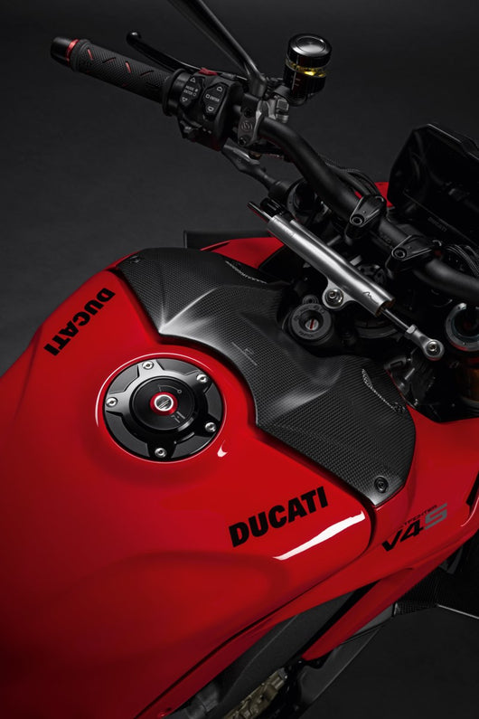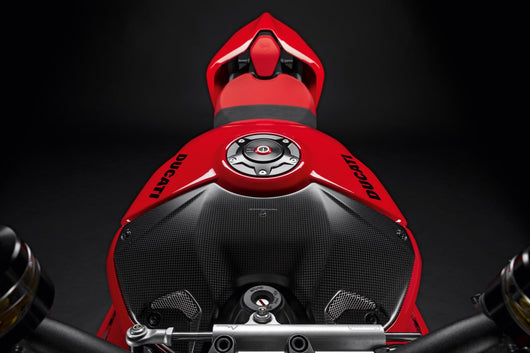 A splendid detail that embellishes the front of the tank in a way that only carbon fibre can. The finishing and lines of this accessory are perfectly integrated into the racing look of this super sports bike.