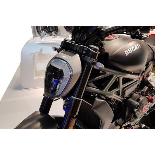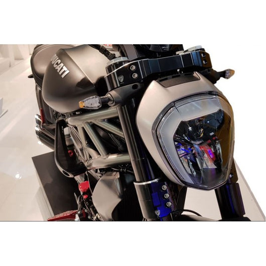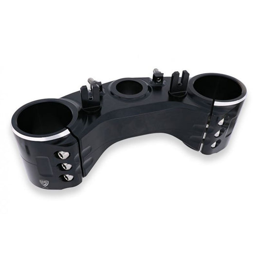Bottom yoke made in light alloy, machined from solid and then anodized.Plate respects the oem angle of inclination.Fixing screws, in lightned stainless steel, are included.