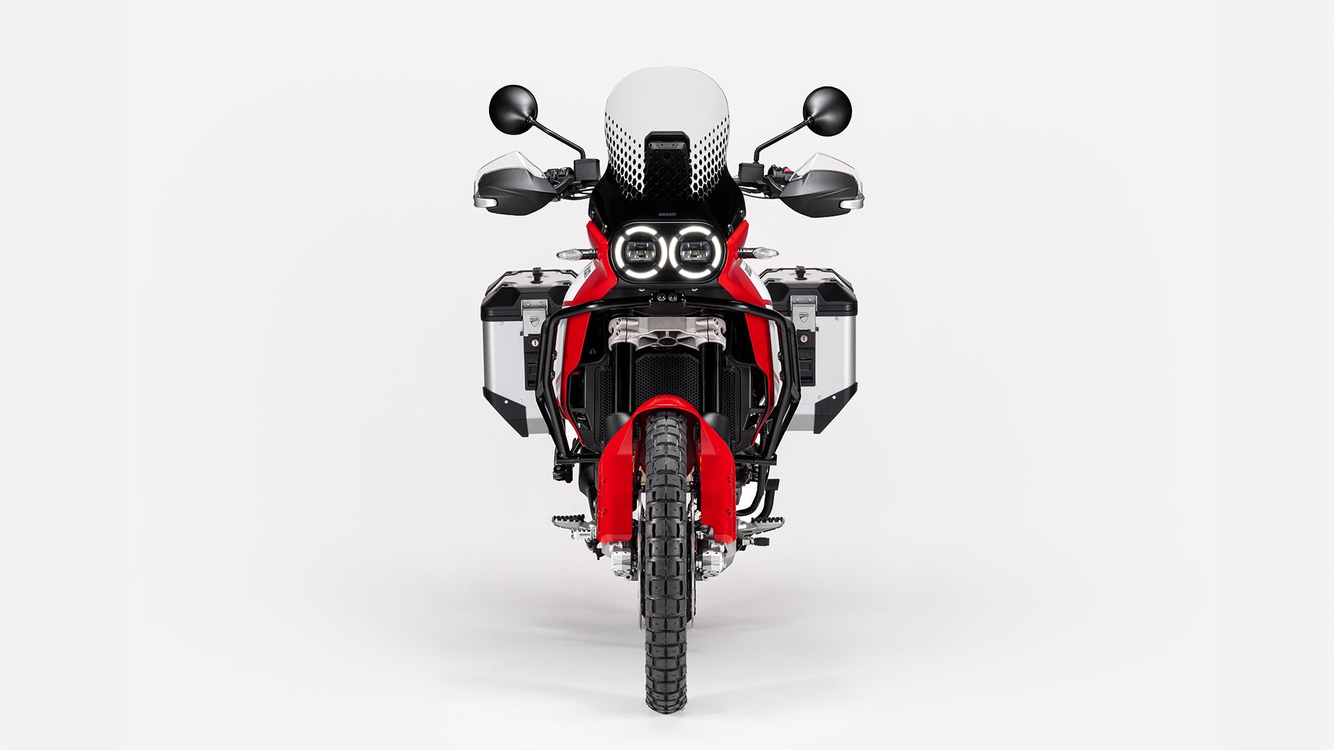 The DesertX Discovery trim includes a dedicated Thrilling Black and Ducati Red livery created with adhesive graphics to protect surfaces from scratches and a comprehensive package of standard accessories to make it even better suited to exploration.