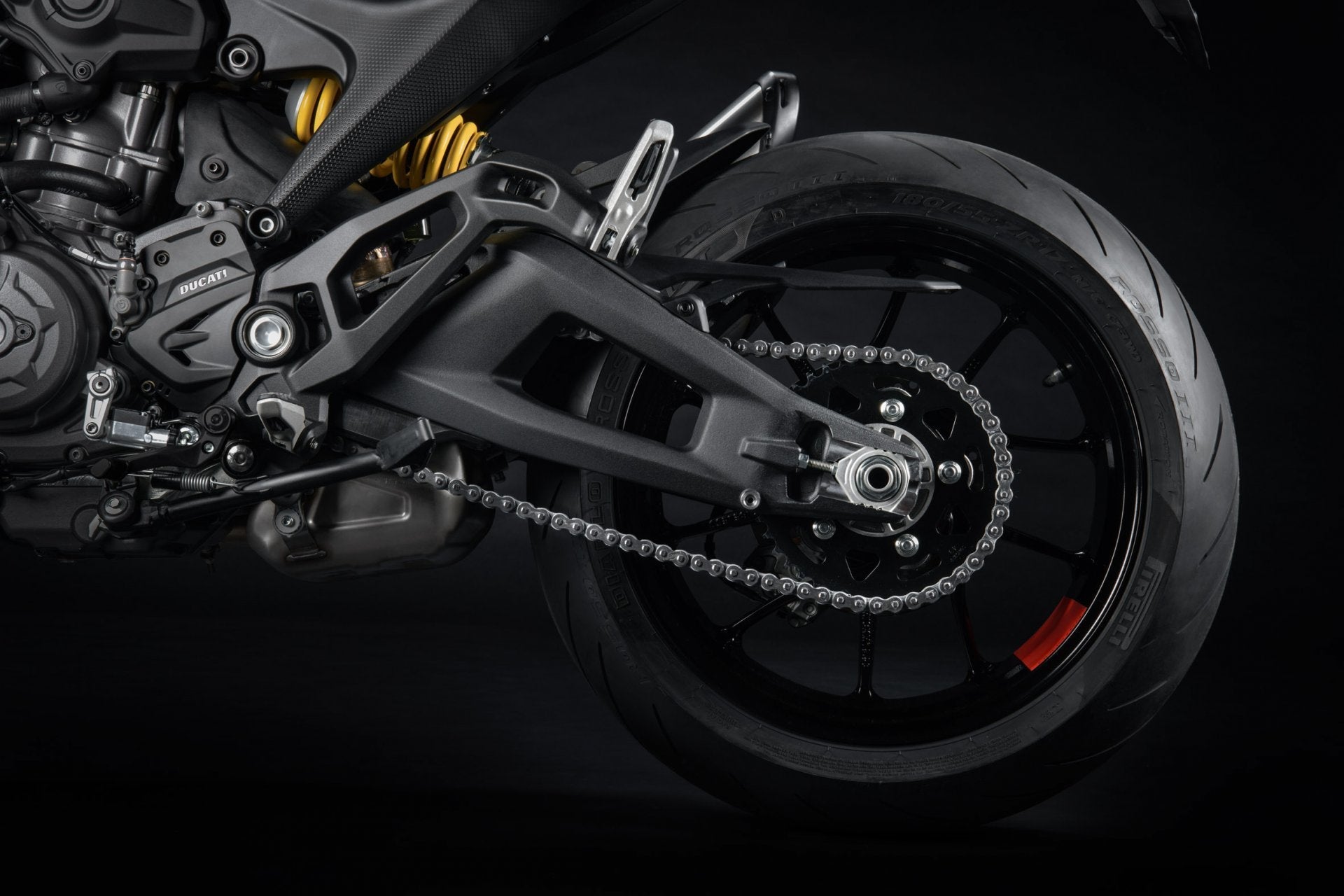 The new Monster is powered by the 937 cc twin-cylinder Desmodromic Testastretta 11° engine. In this latest version its weight has been reduced (-5.3 lb), now achieving further performance as well as usability levels. Designed to be a stressed chassis element, the twin-cylinder represents a crucial element capable of ensuring the motorcycle overall lightness.