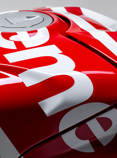 The iconic Supreme logo. The white and red colors stand out on the bold and minimalist aesthetic of the Streetfighter. The dedicated livery, conceived by Supreme and Aldo Drudi, transforms every moment aboard into a declaration of style and exclusivity.