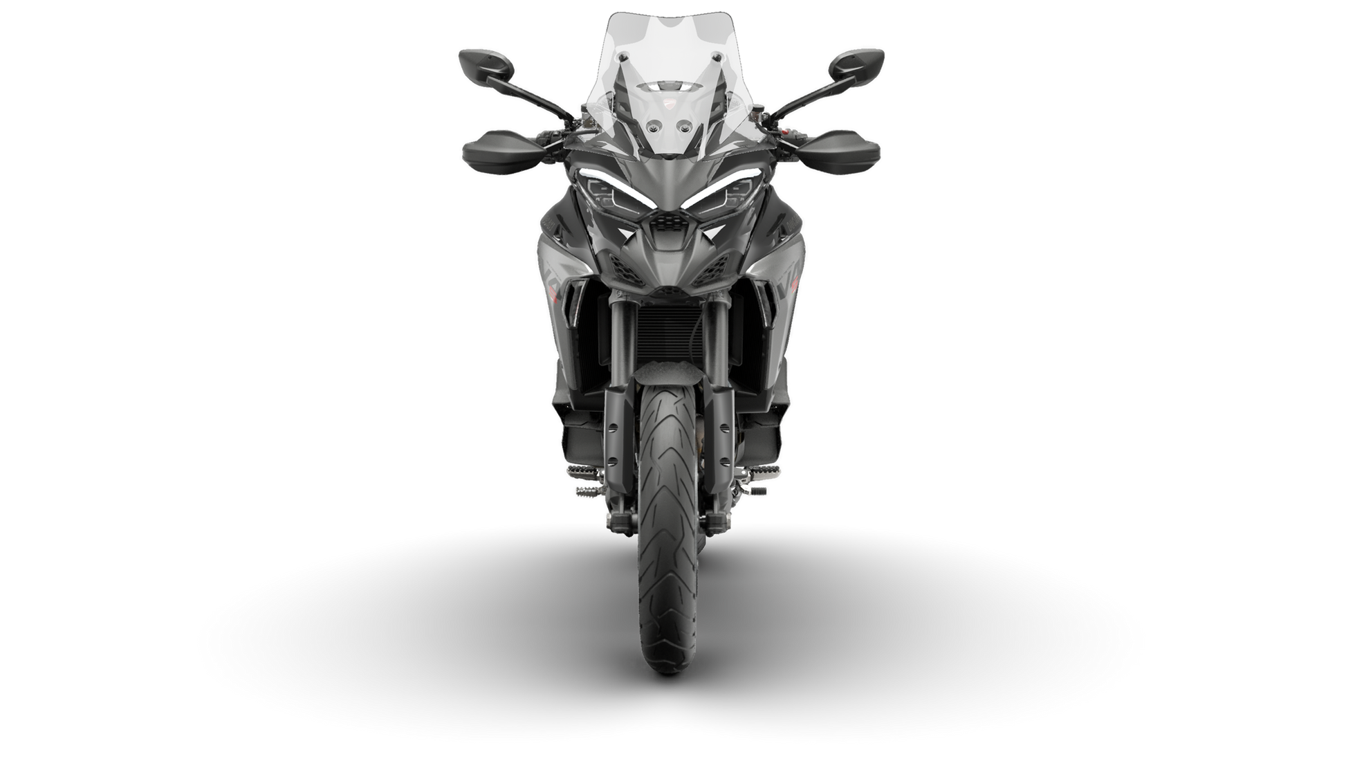 With its accentuated proportions, the new front-end design transmits dynamism and sports attitude while ensuring excellent aerodynamic protection for rider and passenger. The front view accentuates the audacious attitude of the Multistrada V4.