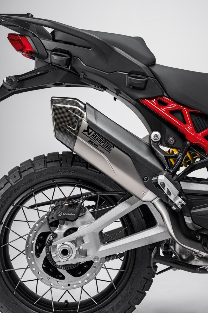 The unmistakable Ducati design is combined with Akrapovic's skilful workmanship to create an exclusive accessory that gives the bike a more aggressive look. The titanium alloy body and fibre carbon endcap guarantee lightness and resistance to high temperatures and, thanks to the honeycombed gas outlet spouts, provide for an even more unmistakeable look. The silencer further improves the power-to-weight ratio, for optimal performance. The style of this accessory goes perfectly with the bike's design, giving it a touch of sportiness.