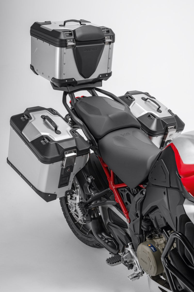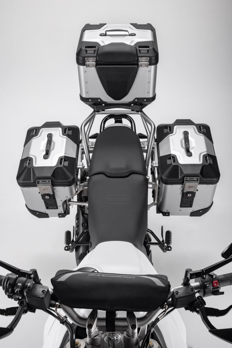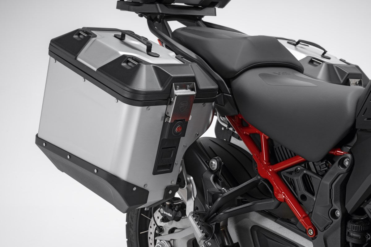 An elegantly designed strong accessory representing the perfect combination of functionality and style. Made from aluminum, they maintain the natural color over time thanks to high-quality anodizing. The significant total capacity of 76 liters will allow you to bring all you need for the journey, without affecting motorbike's handling. An element of great style, perfect to make every adventure on your bike unforgettable.