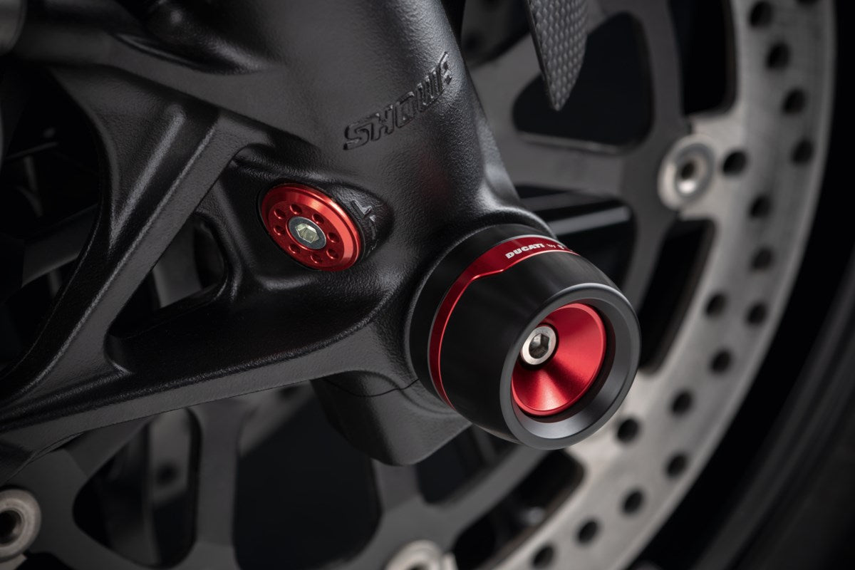 The unmistakable Ducati design is combined with Rizoma's experience to create an invaluable accessory, made of high quality anodized aluminum, which protects the fork in the event of a fall. The high-quality machining adds a touch of style that enriches the front end of the bike.
