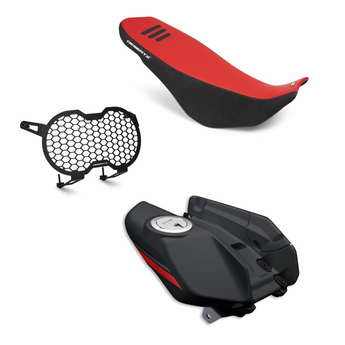 The package contains: auxiliary tank, headlight protective grille, Rally seat, adhesive tank protector.