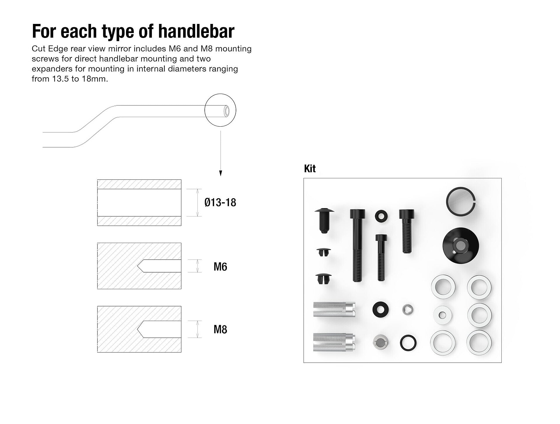 The included Mounting Kit will allow to fit the mirror in 3 configurations: direct clamping on any handlebar with a 22-25.4 mm external diameter; bar end (included) on any handlebar with a 13.5-18 mm inner diameter and minimum 30 mm of free dept space; bar end (included) on any handlebar with M8 and M6 inner tread.