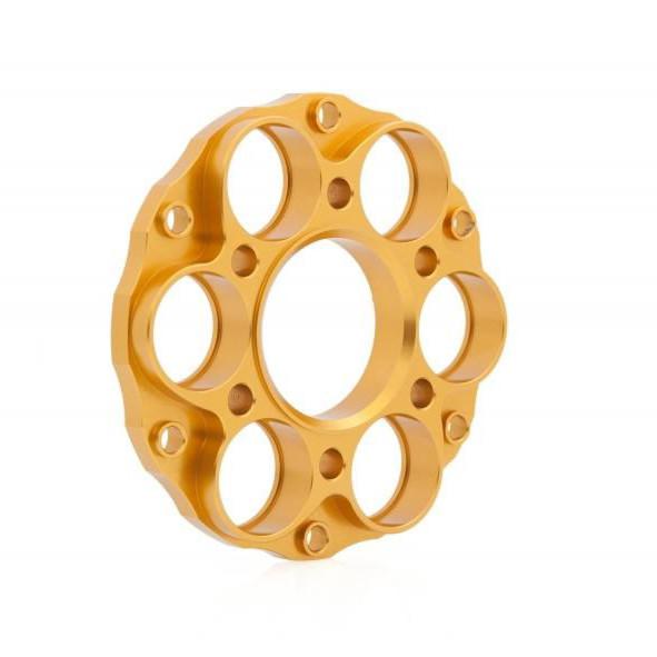 Cush drive hub flange CNC machined from light alloy billet and then given a colored anodized surface finish. Installation screws are supplied.
