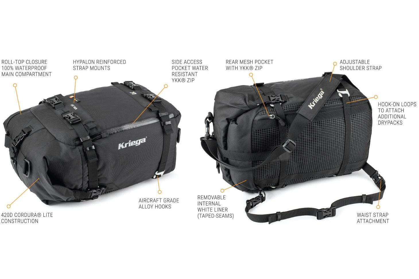 Kriega's best selling US-Drypack System has led the way for universal-fit, waterproof carrying on a motorcycle for over 15 years. Now the classic design has been further enhanced with the introduction of CORDURA® fabrics for the main body construction. With increased durability and abrasion resistance the versatile US-Drypack System provides guaranteed all-weather protection for your gear on any type of motorcycle.