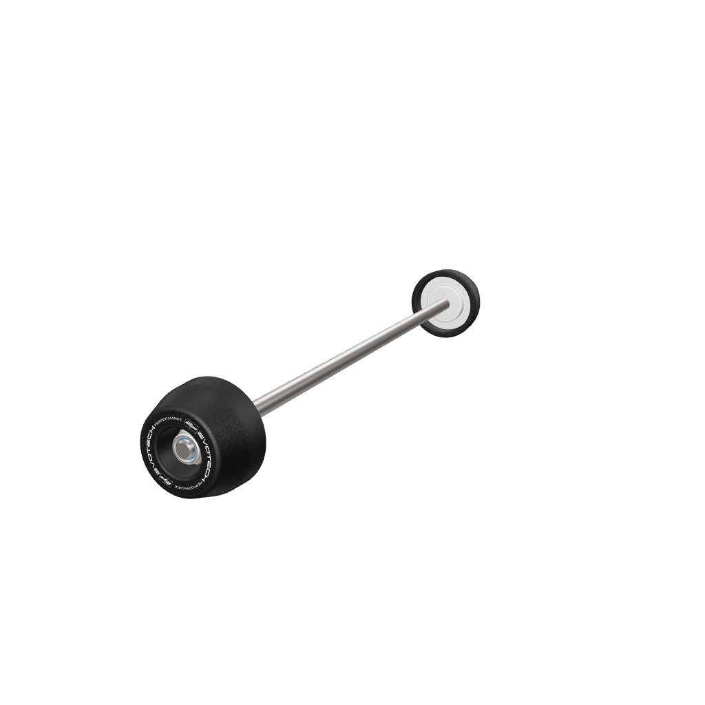 Offering protection to the front wheel spindle, lower front forks and brake calipers, EP Front Spindle Bobbins are discreet yet strong. The black bobbins sit snugly either side of the front spindle, held in place by a rolled-thread spindle rod. The durable materials of injection-molded nylon and aluminum hope to be first to receive impact should an incident occur. Additionally, the nylon outers are able to twist with collision to reduce stress and wear on the wheel and bobbins.