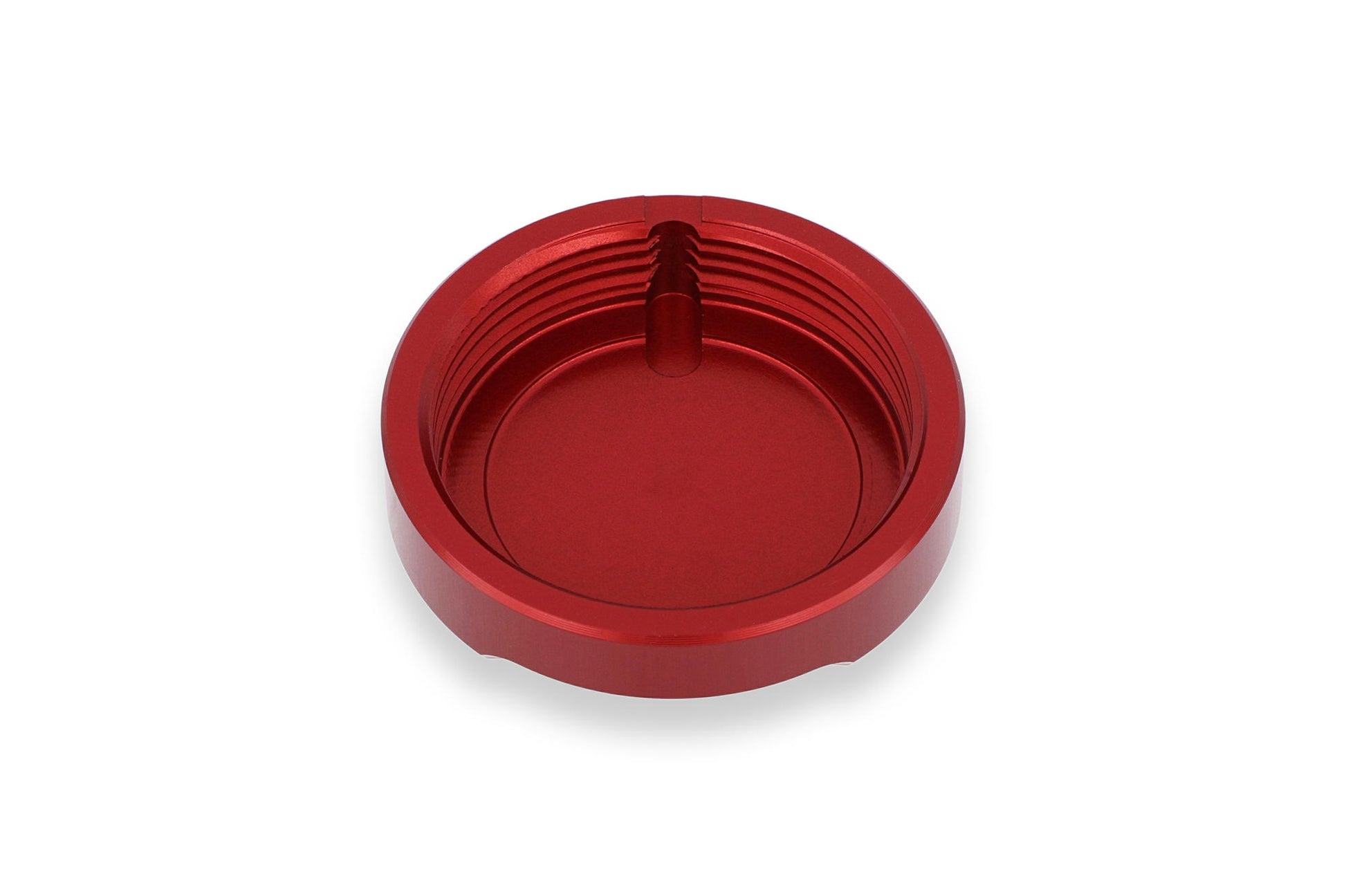 Fluid reservoir cap CNC machined from light alloy billet and then given a colored anodized surface finish, which, in addition to coming in a wide range of colors, delivers quality and lasting service life.