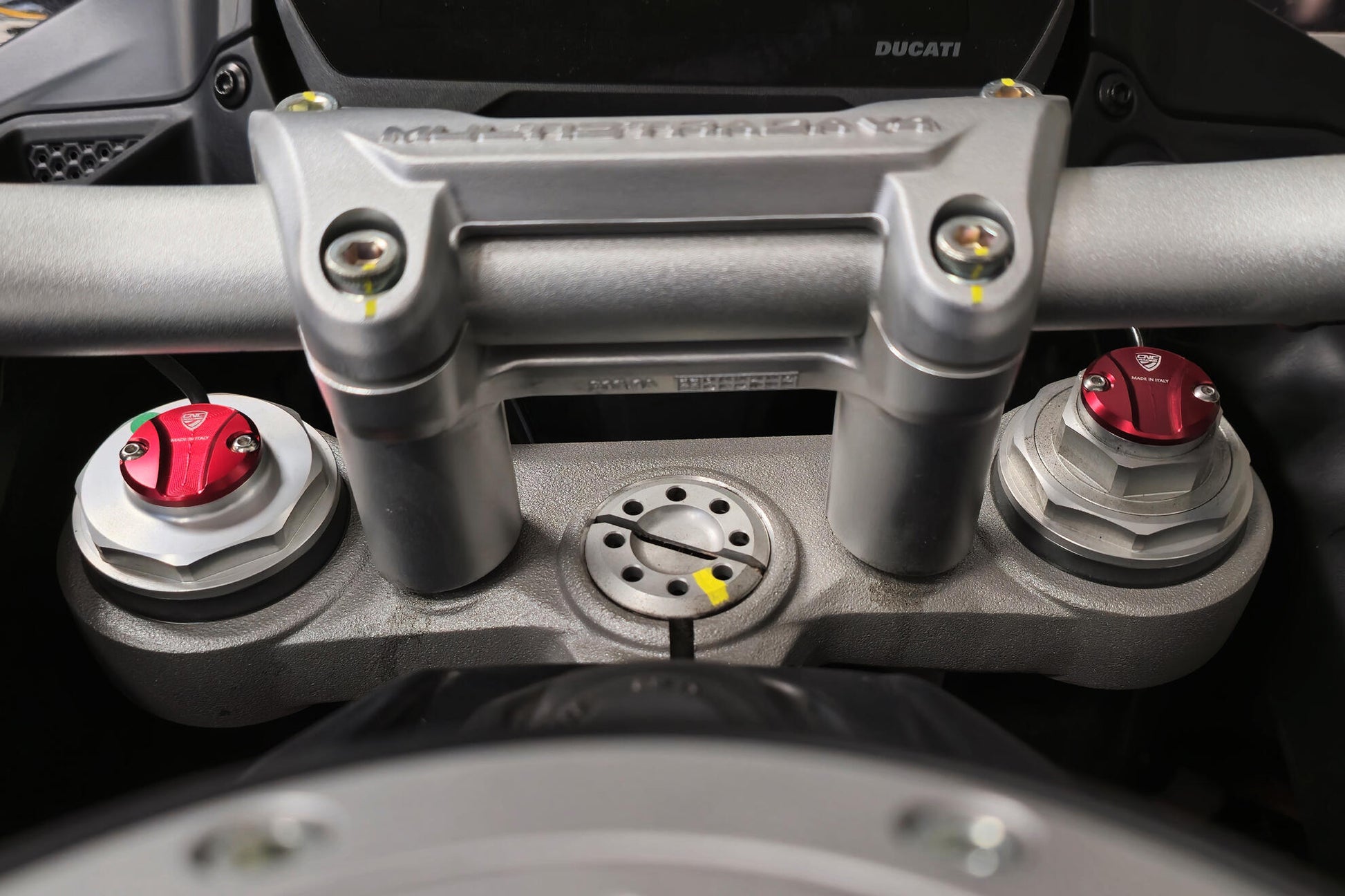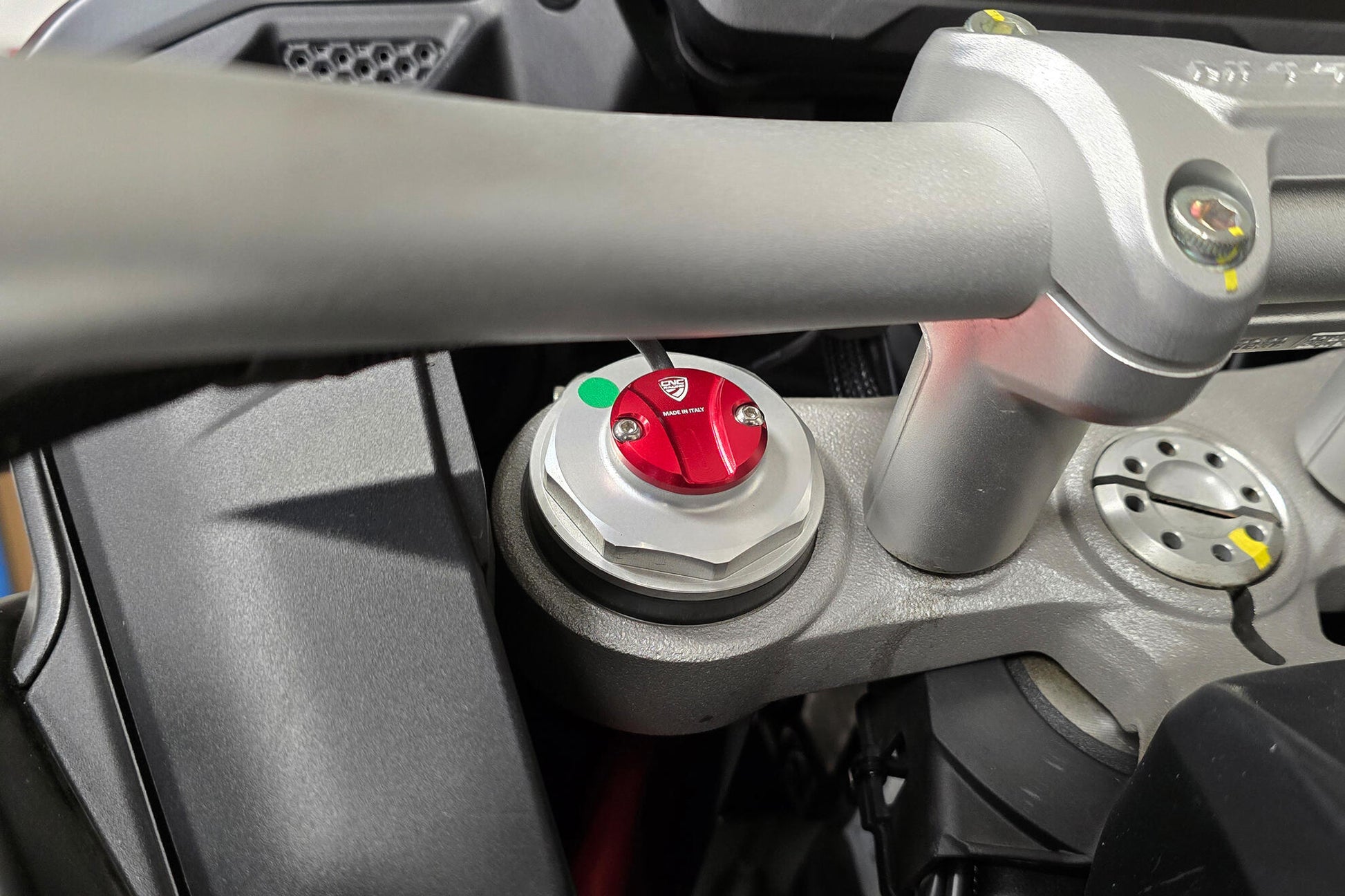 Cover for the fork leg cap for Ducati Multistrada V4 S and Rally made in light alloy, machined from solid and then anodized.
