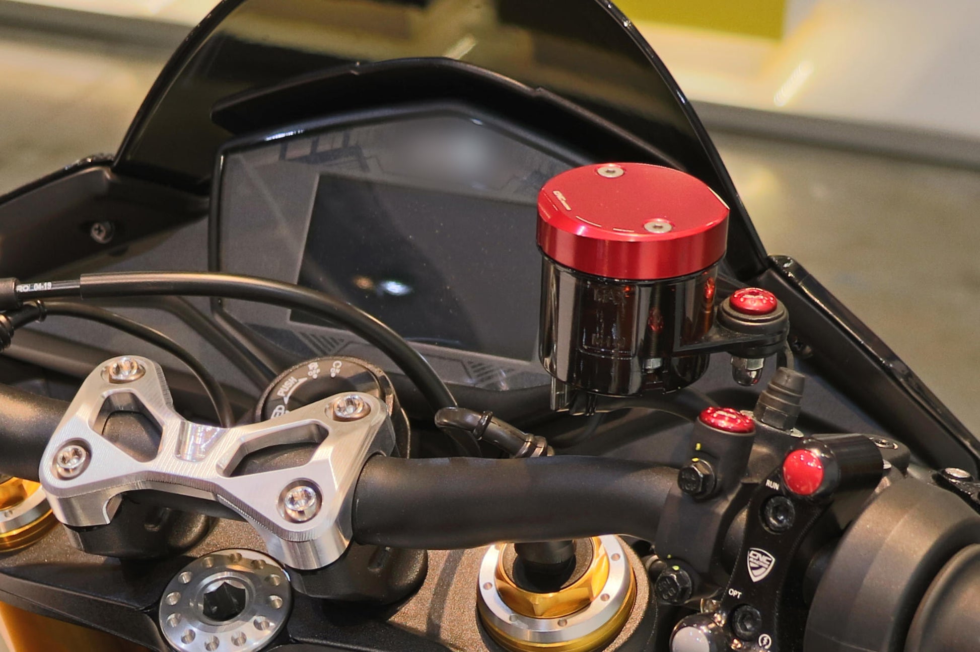Fluid reservoir cap CNC machined from light alloy billet and then given a colored anodized surface finish, which, in addition to coming in a wide range of colors, delivers quality and lasting service life. The minimalist and modern design gives it a an innovative aesthetics.